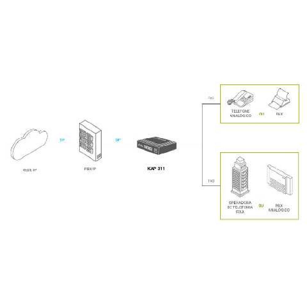 O modelo KAP 311 se destaca pela sua arquitetura: 1 porta FXO, 1 FXS e 3 portas Ethernet. Isso corresponde a uma porta WAN dedicada ao gerenciamento do dispositivo e da rede, e outras duas para conexão com até dois equipamentos.