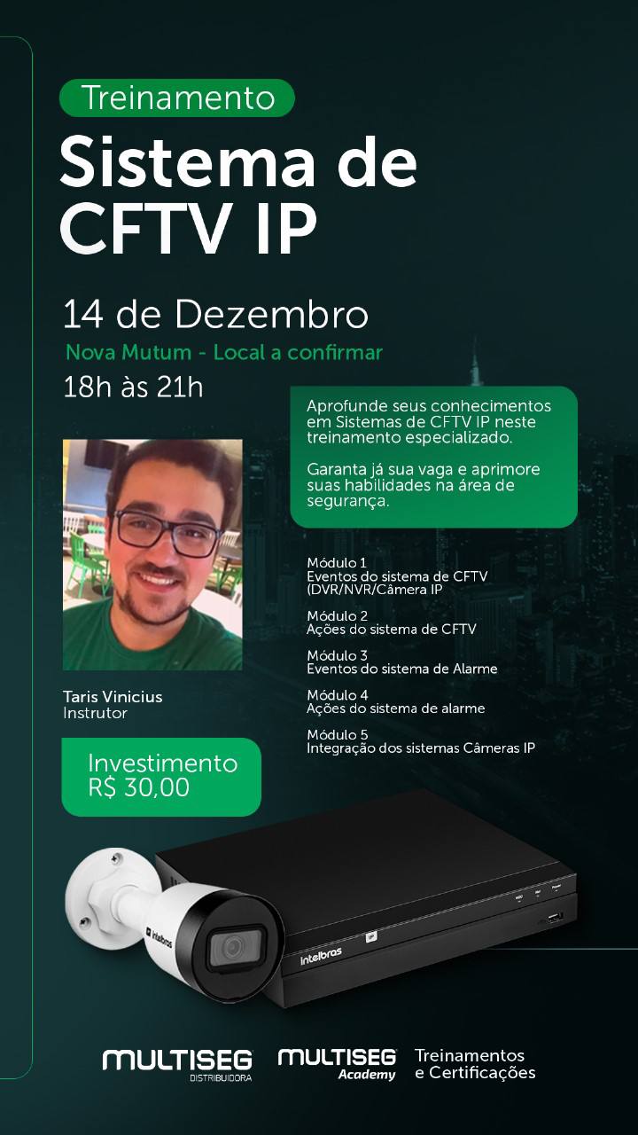 Treinamentos Treinamento - Profissão FTTX Sorriso, MT 08 e 09 de Novembro TREINAMENTO DEFENSE LITE MÓDULO BASE - EVERSON VELOSO - MULTISEG SINOP Multiseg Sinop - MT 16 de dezembro | 18h ás 22h TREINAMENTO DEFENSE LITE MÓDULO BASE - EVERSON VELOSO - MULTISEG SORRISO Multiseg Sorriso - MT 17 de dezembro | 18h ás 22h TREINAMENTO DEFENSE LITE MÓDULO BASE - EVERSON VELOSO - MULTISEG MUTUM Multiseg Mutum - MT 18 de dezembro | 18h ás 22h TREINAMENTO INTELBRAS SEGURANÇA ELETRÔNICA - INSTRUTOR MAICO - MULTISEG ALTAMIRA Altamira, PA 24, 25 e 26 de fevereiro de 2026 | 18:30h